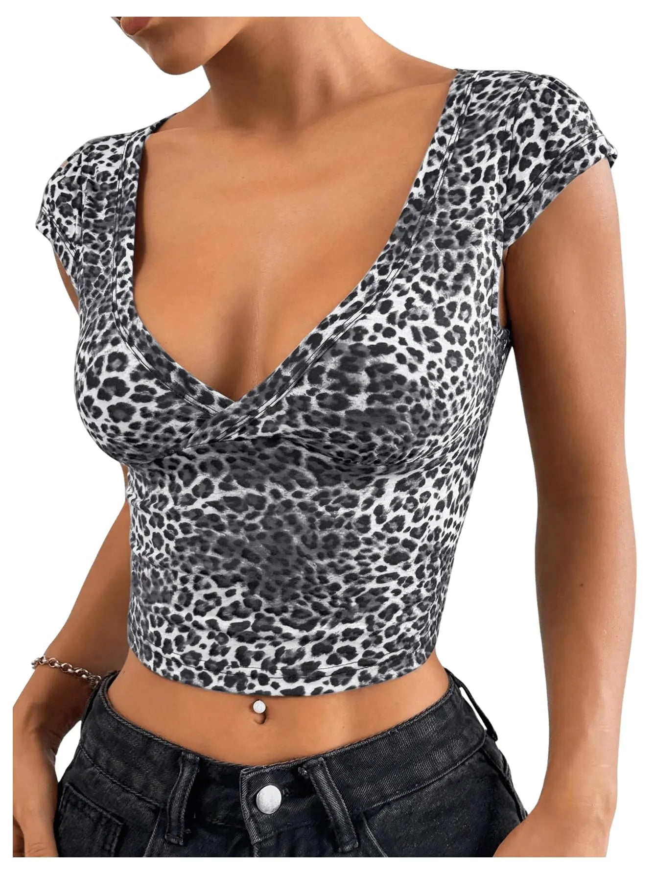 Floerns Womens Leopard Print Cap Sleeve T Shirts V Neck Y2k Crop Top Tee Shirts Grey Small